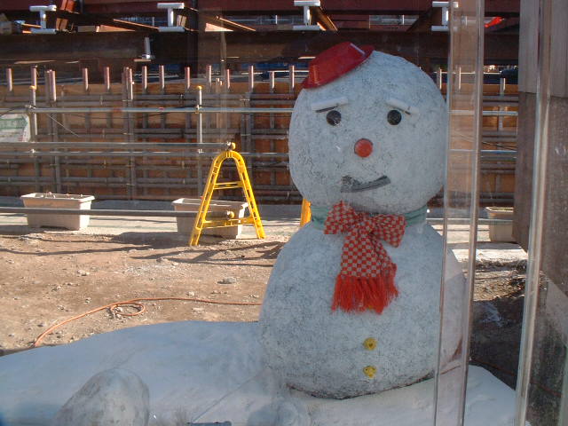 お疲れモードのサンタさんと困った顔の雪だるま。